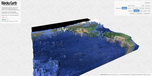 Blocky Earth 範囲が狭いとなにがなんだかわからない感じだけども、十分に引きで設定すれば画像のように大陸ごと閲覧できます。 都市名などで指定すると、座標のデータを持ってくるみたい。
